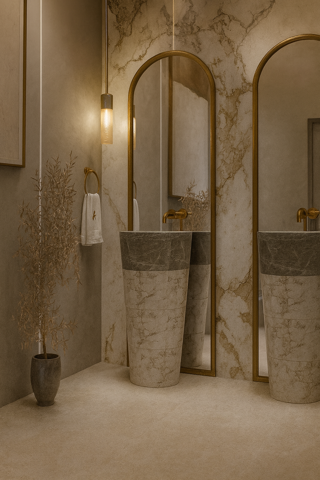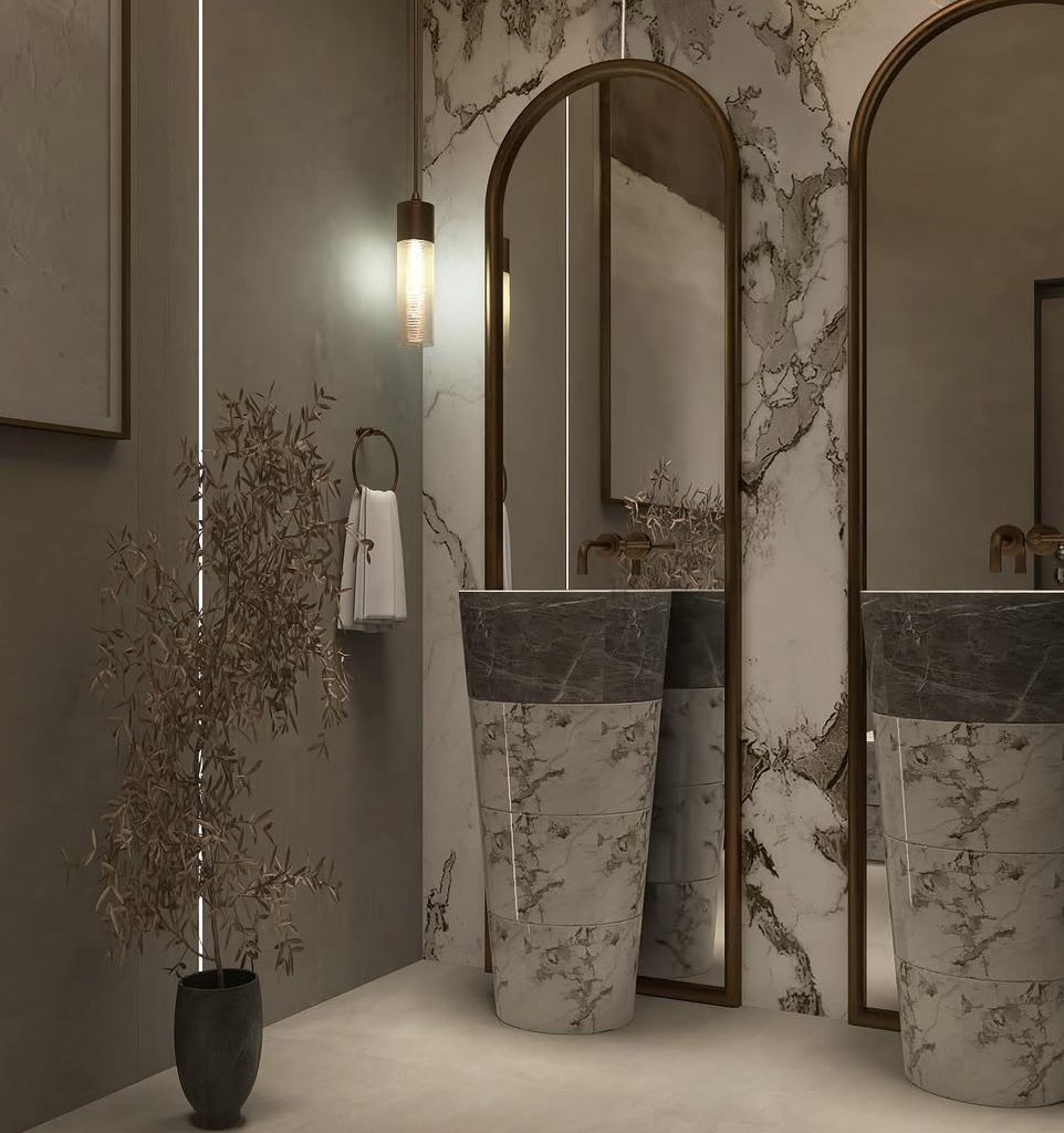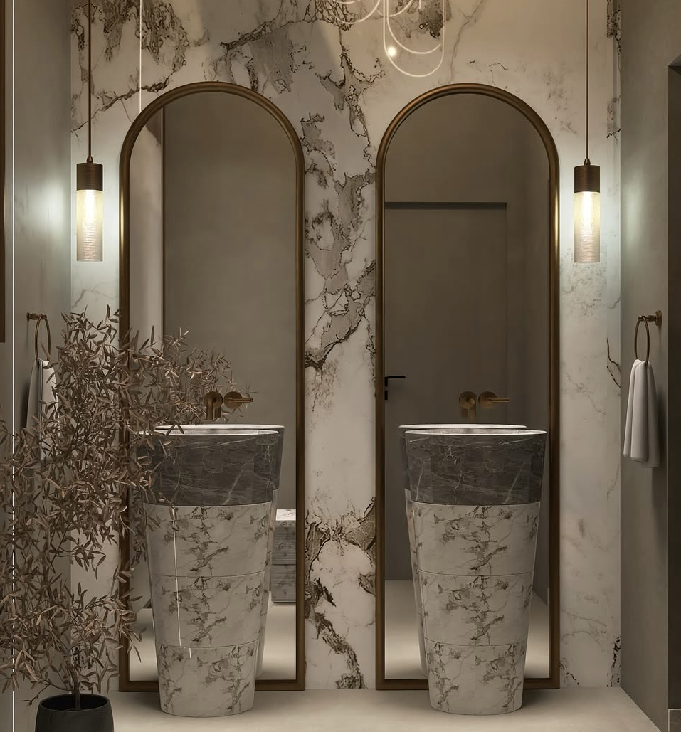 Nel cuore del Ristorante di M.B a Cesena, anche il bagno si trasforma in un’esperienza di design. Il progetto prevede un doppio lavabo scultoreo a colonna in marmo, incorniciato da due specchi ad arco che amplificano la verticalità dello spazio. La parete retrostante in gres effetto marmo con venature marcate dialoga con le finiture metalliche calde dei rubinetti e degli accessori, creando un equilibrio tra matericità e raffinatezza.