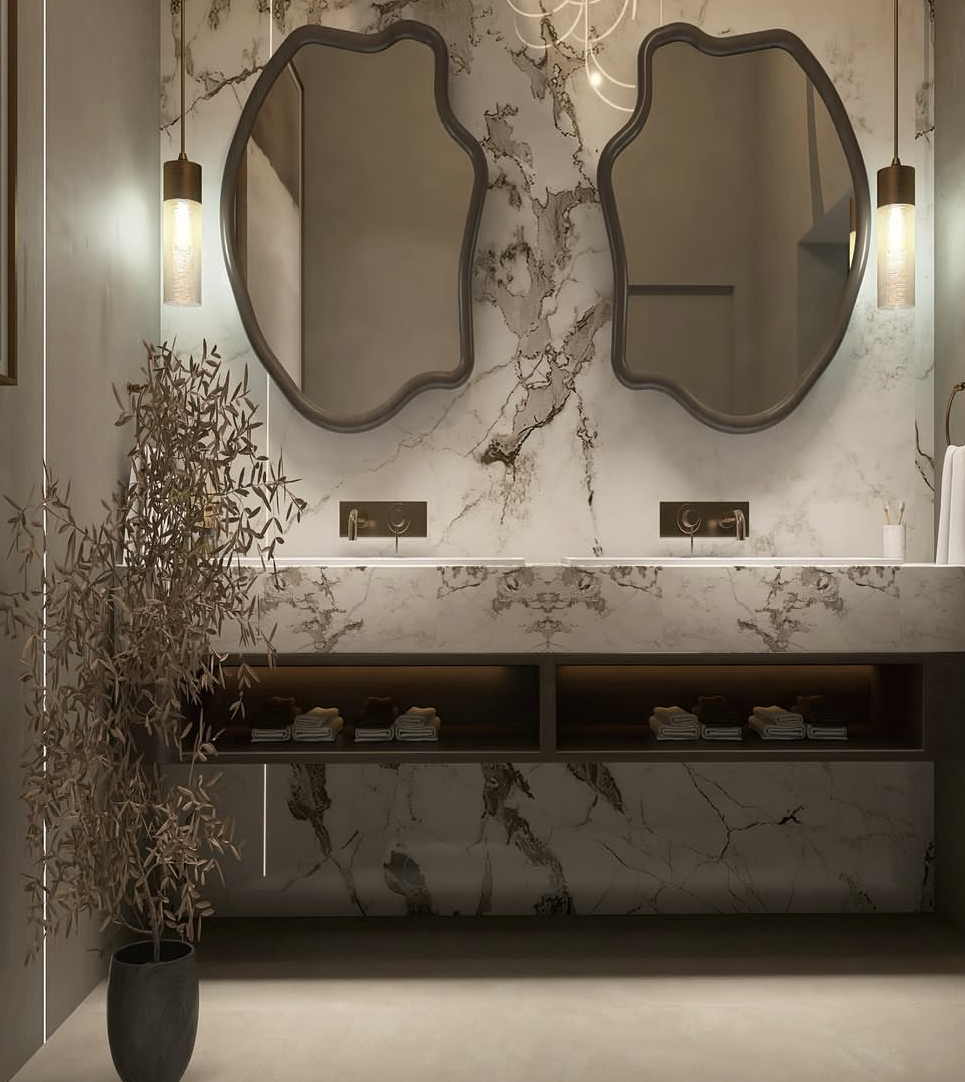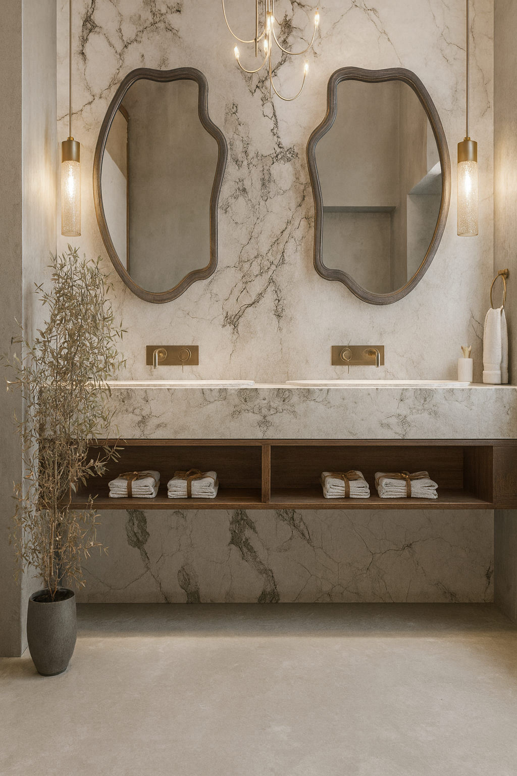 Gli specchi irregolari, come opere d’arte sospese, introducono un gesto di libertà e movimento che rompe la rigidità simmetrica, mentre le luci pendenti incorniciano la scena con una luce calda e diffusa.