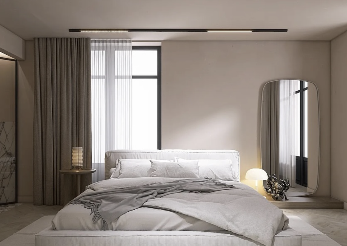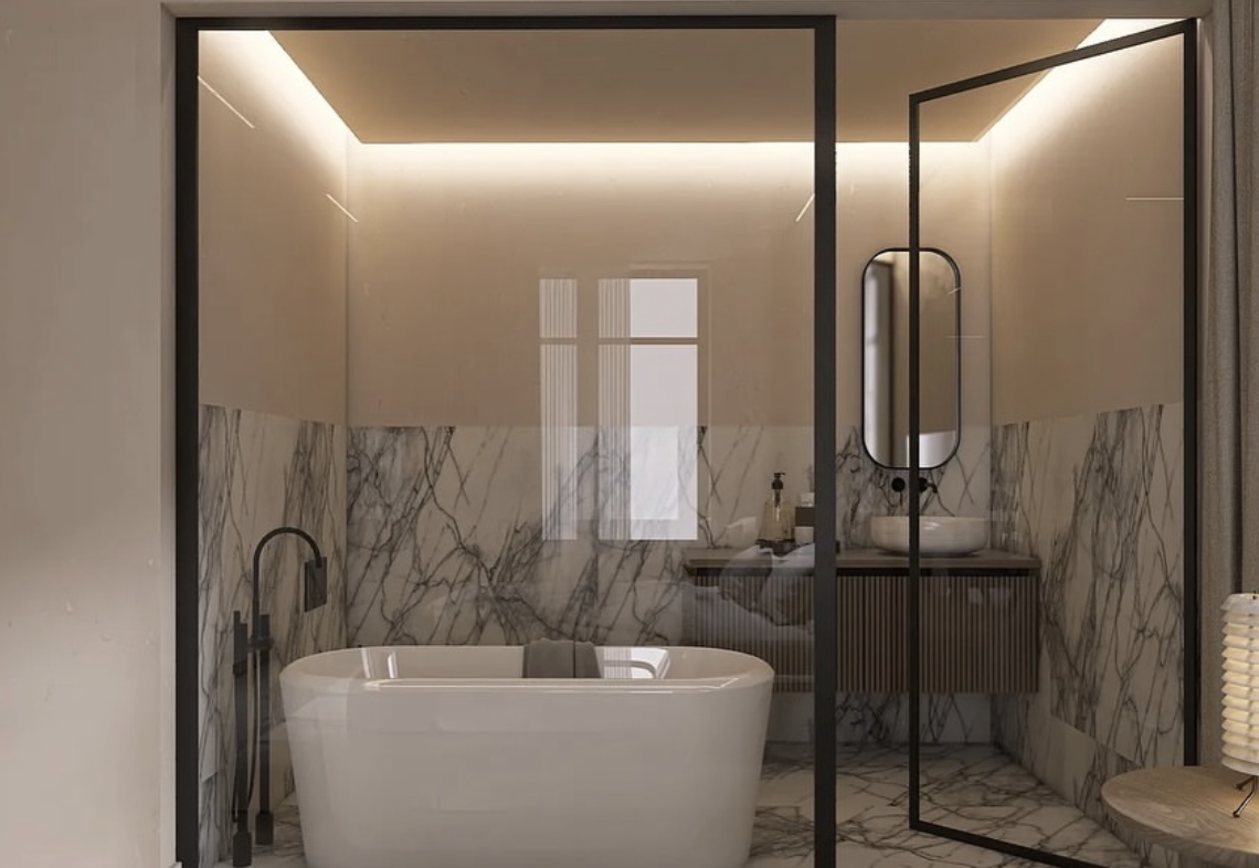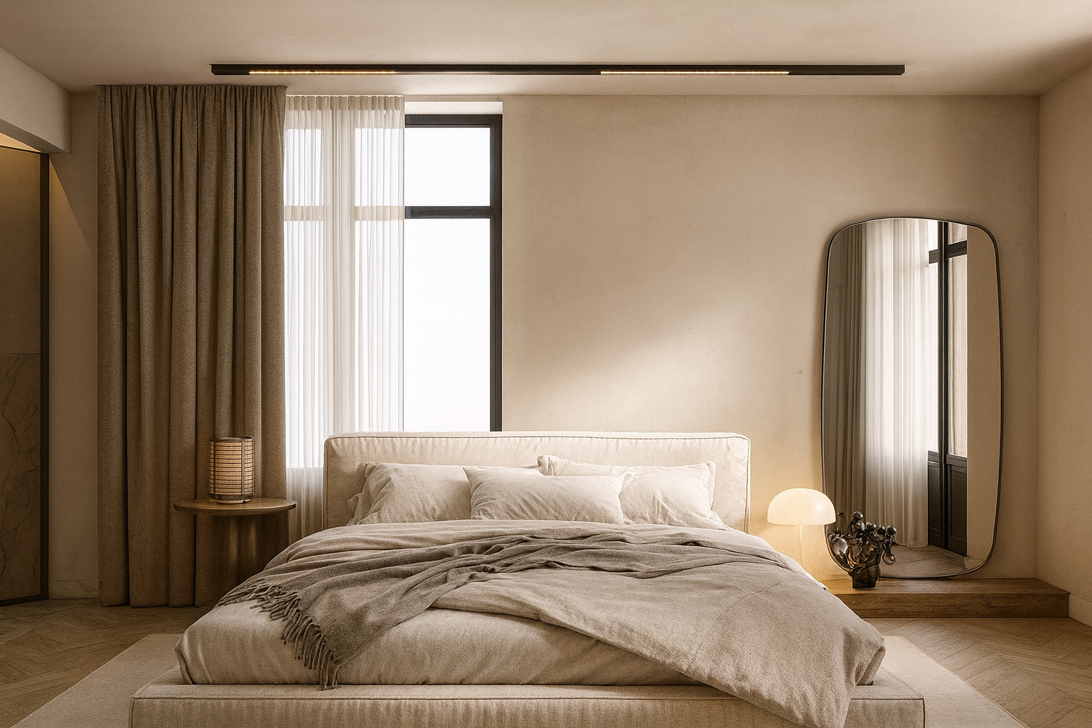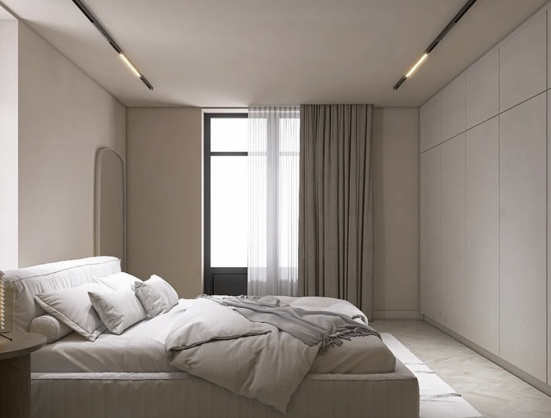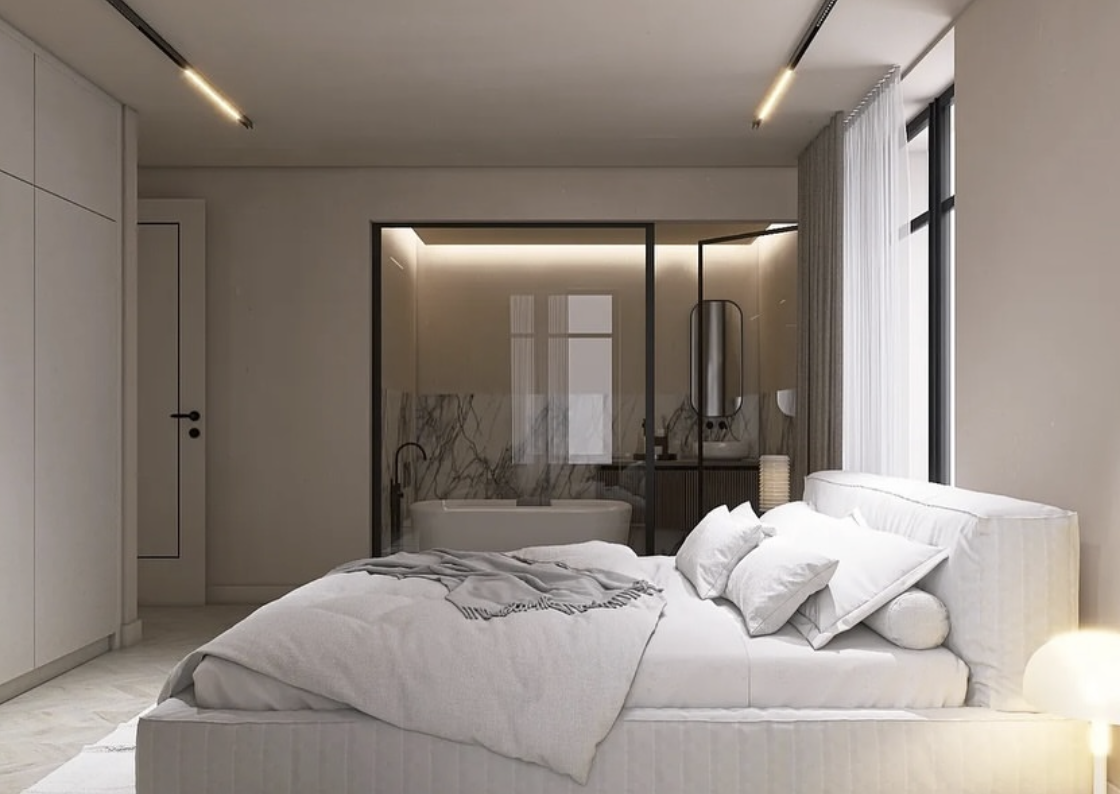 Nella camera da letto ho ricreato un contesto intimo e raffinato, con un’attenzione particolare ai dettagli e alla resa luminosa. Accanto ad essa, il bagno è stato progettato in modo essenziale e funzionale, caratterizzato dalla presenza di una vasca e di un mobile con lavabo, senza bidet né water, per mantenere uno stile minimale e coerente con l’insieme.
