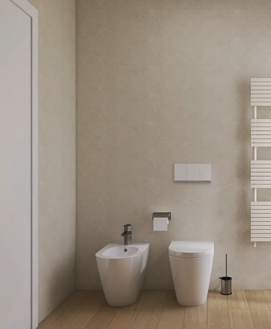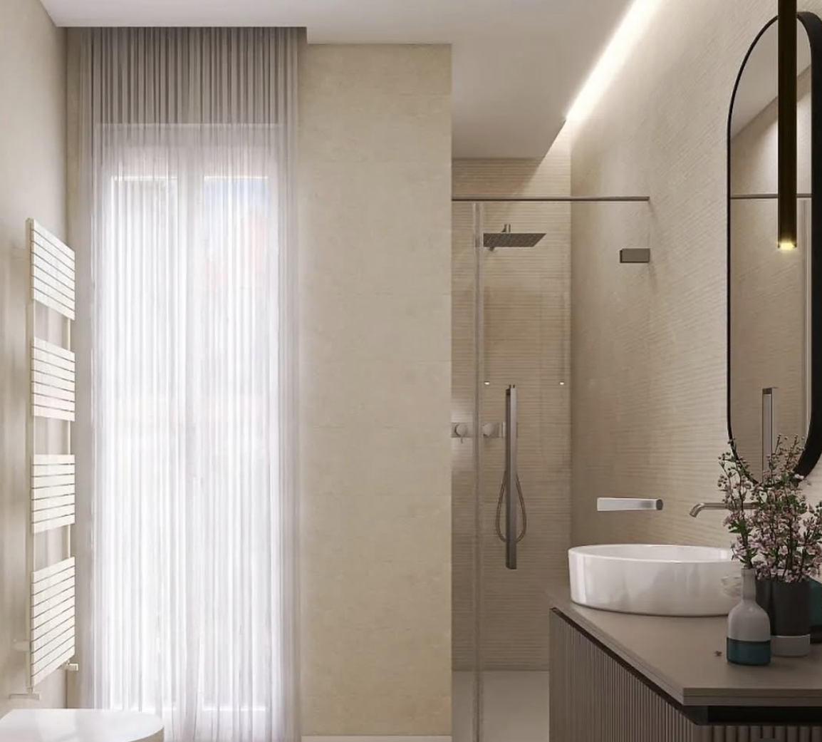 Il bagno è stato concepito come un rifugio intimo e contemporaneo: linee essenziali, materiali resistenti e una luce calda e avvolgente esaltano la purezza del design, trasformando l’ambiente in un luogo di benessere quotidiano.