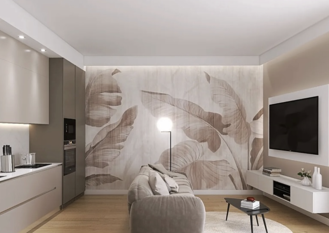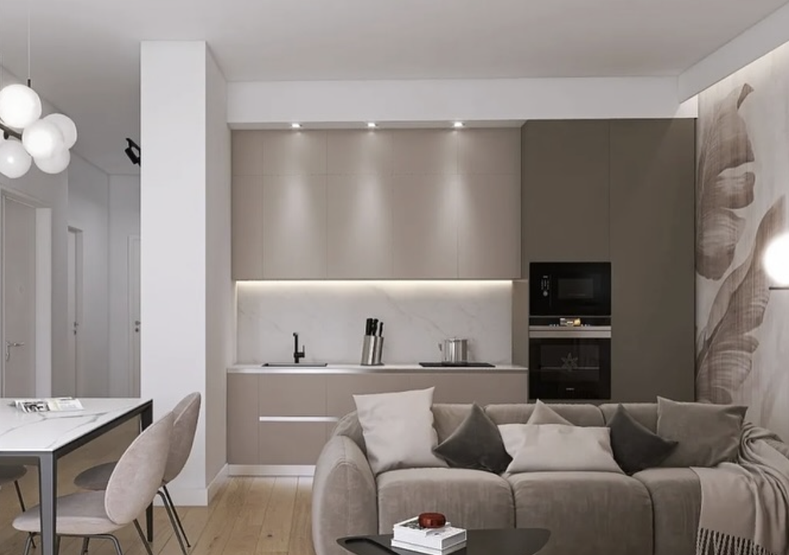 L’open space rappresenta il cuore della casa, dove la cucina lineare, con tonalità neutre e sofisticate, dialoga armoniosamente con la zona living. La scelta di superfici pregiate, come il calacatta, e la presenza di elementi decorativi unici, come la carta da parati artistica, contribuiscono a creare uno spazio che invita alla convivialità e al relax.