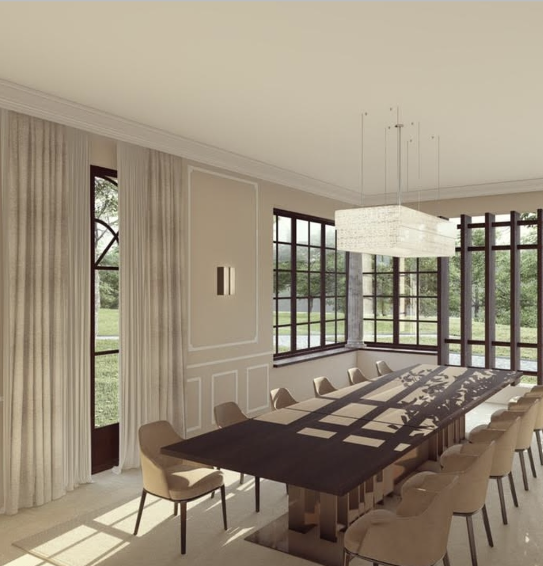 Un ambiente raffinato e luminoso, dove la luce naturale filtra attraverso le ampie vetrate valorizzando i materiali e i volumi. La sala da pranzo combina eleganza e funzionalità, con un tavolo importante e sedute confortevoli, pensati per accogliere e creare convivialità. L’equilibrio tra dettagli contemporanei e richiami classici conferma la cura del progetto in ogni elemento.