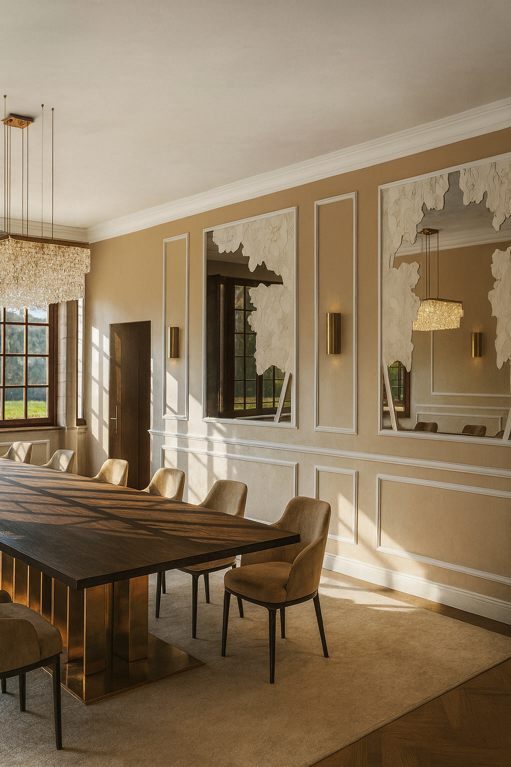 - Sulle pareti, raffinate boiserie con cornici, capaci di incorniciare lo spazio e aggiungere profondità.