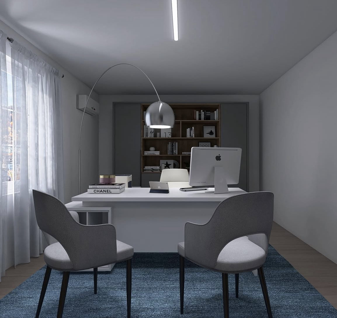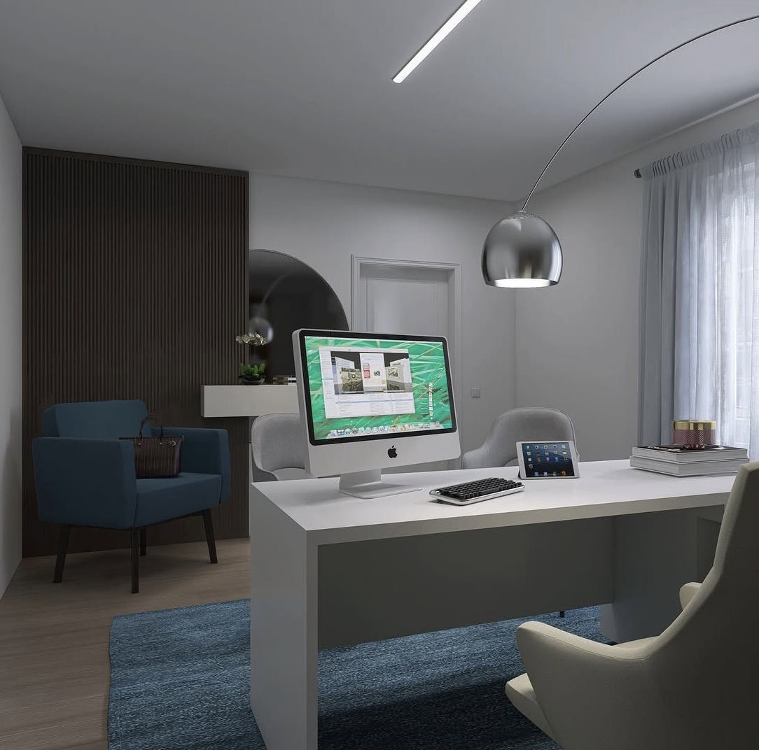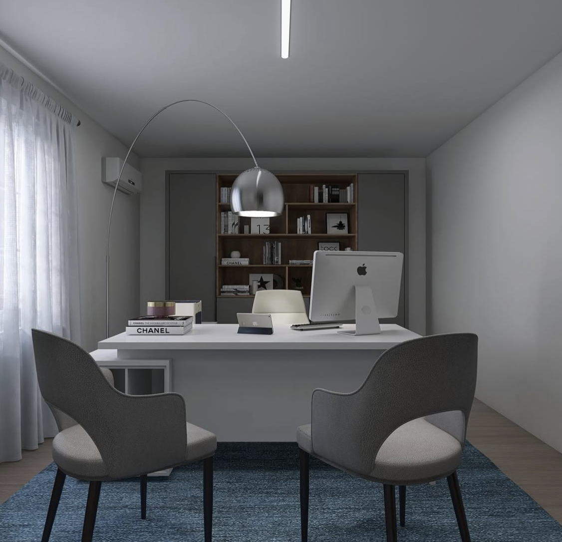Partendo dalla planimetria fornita dalla cliente, ho sviluppato il layout degli spazi, studiando una distribuzione funzionale che rispondesse alle esigenze lavorative e di accoglienza. Successivamente ho definito il budget di progetto e individuato lo stile più adatto, capace di trasmettere professionalità e allo stesso tempo un senso di comfort e cura del dettaglio.