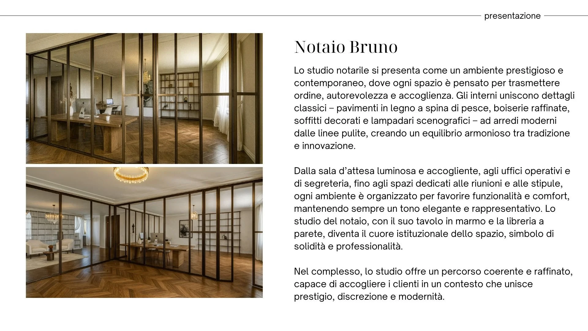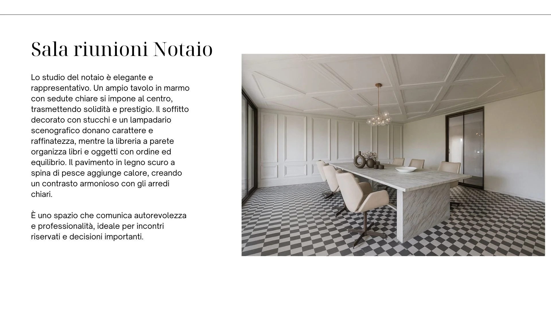 Parallelamente, sempre per lo stesso studio, ho sviluppato il progetto per uno studio notarile a Faenza. In questo caso ho interpretato lo stile e l’identità del cliente, traducendoli in render 3D personalizzati che potessero restituire l’atmosfera desiderata. Ho inoltre realizzato una presentazione con diverse proposte di arredo, così da fornire una visione concreta delle possibili soluzioni e facilitare le scelte progettuali.